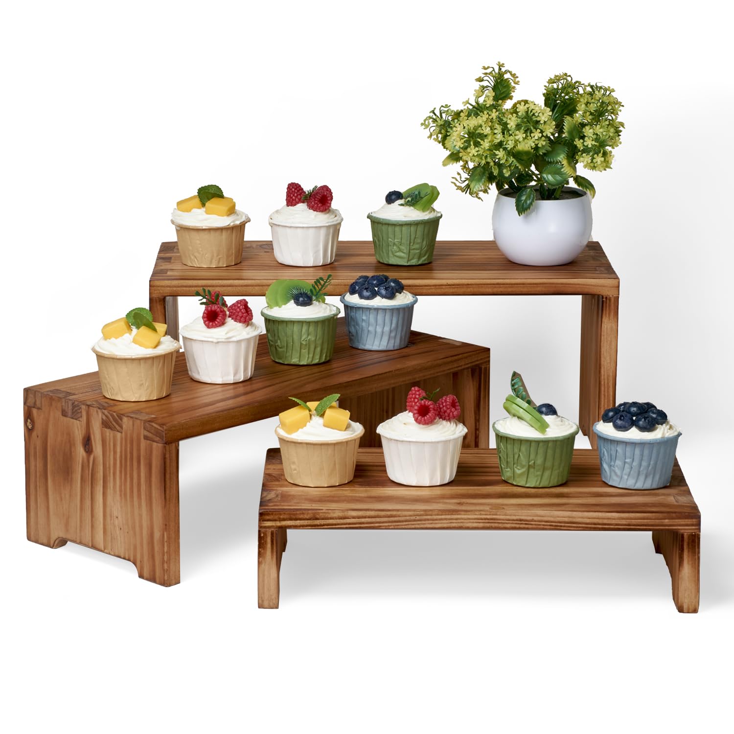 • RUSTIC CHARM & ELEGANCE: Each stand is crafted from high-quality wood with a rich, torched finish, bringing a warm, farmhouse feel to your dessert table. The natural wood grain of these stands beautifully complement your treats, making them the centerpiece of any occasion