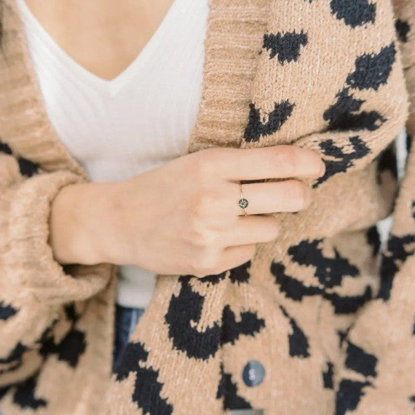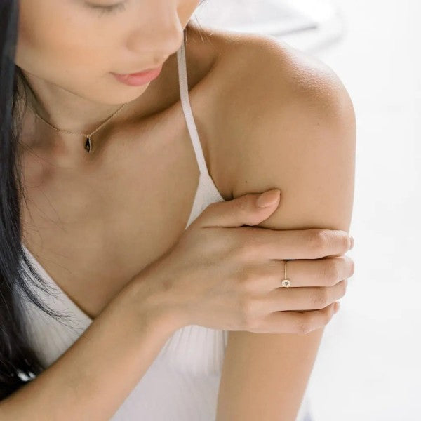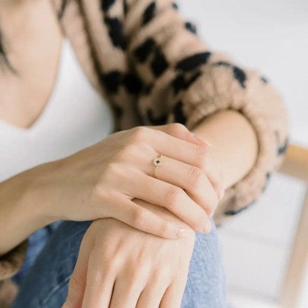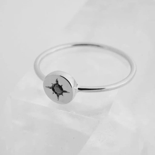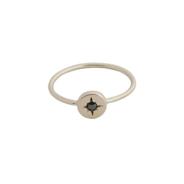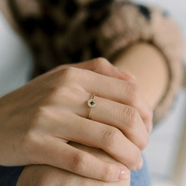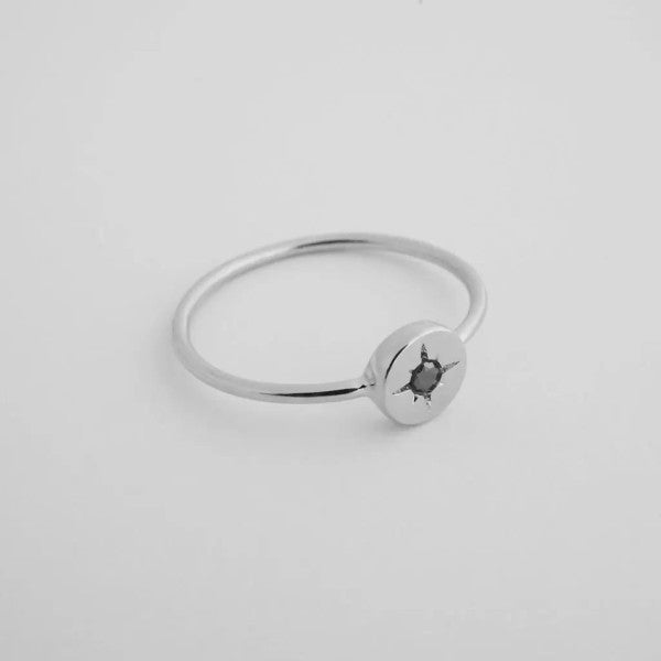 A thin band detailed with guiding starburst and dotted with a black crystal. Slim, lightweight, and dainty - which basically makes it the perfect addition to your ring stack.