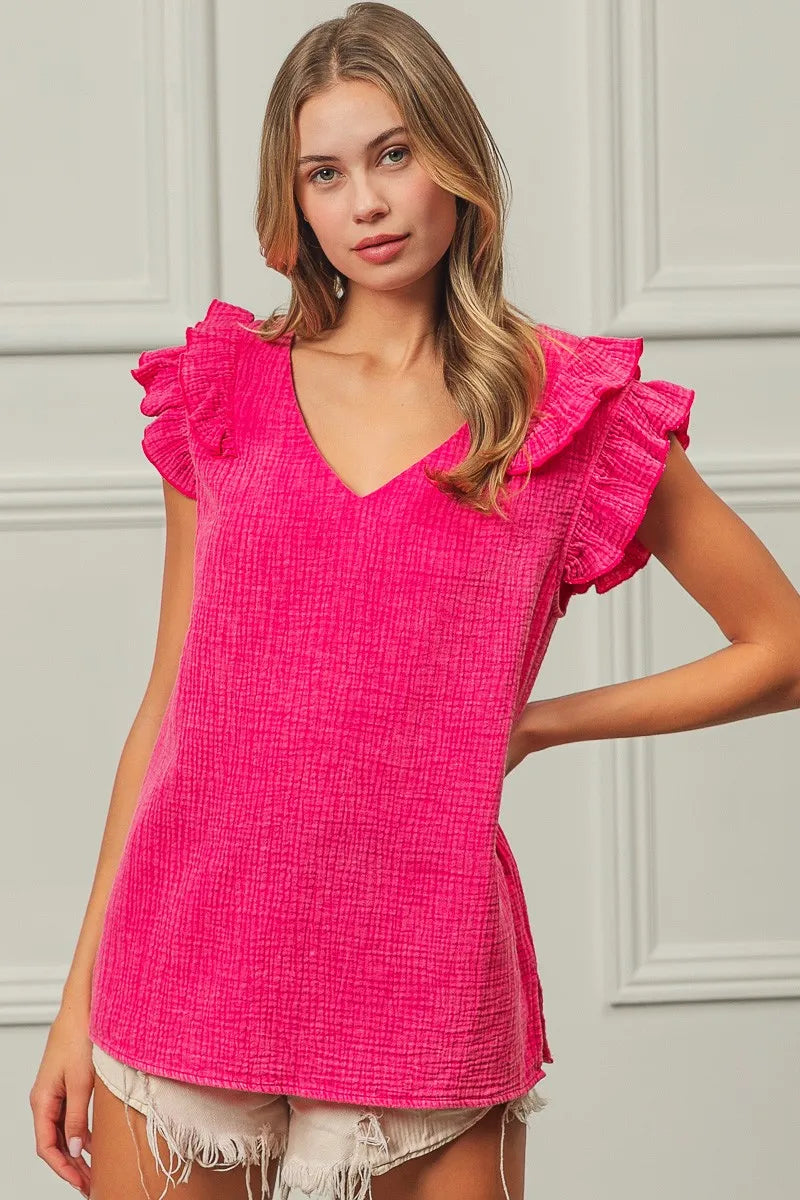 Umgee Full Size Textured Notched Balloon Sleeve Blouse Plus Size