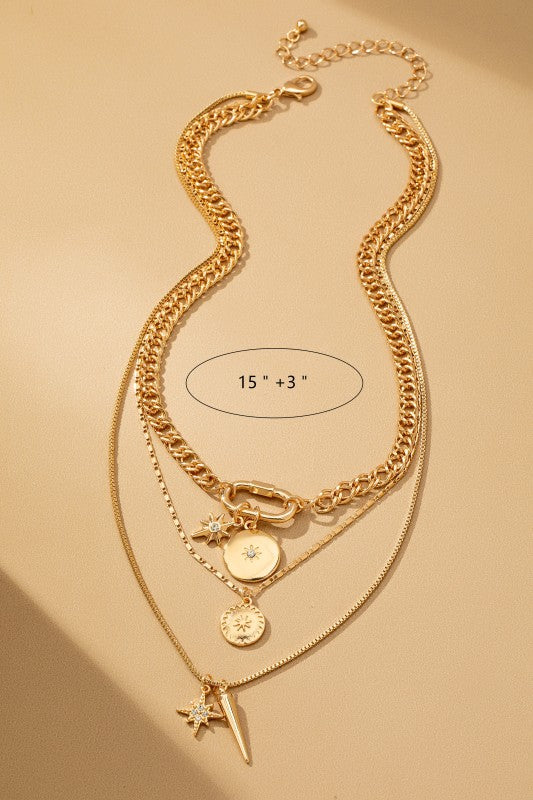 This three-layer gold-tone necklace combines bold texture with delicate celestial details for an effortlessly layered look. The top layer features a polished curb chain that adds structure and shine. The middle layer pairs a slimmer chain with a smooth round sunburst disc accented by a tiny crystal at the center.