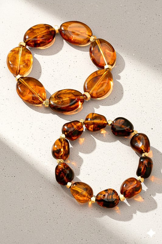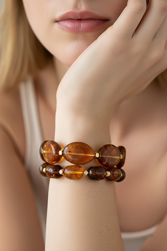 A warm, glowing bracelet crafted with oversized amber-toned resin beads that mimic the rich, marbled depth of natural amber. Each oval bead features swirling golden and honey hues that catch the light beautifully, separated by faceted gold-tone spacers for a polished finish. The stretch design makes it easy and comfortable to slip on and off while maintaining a bold, sculptural look.