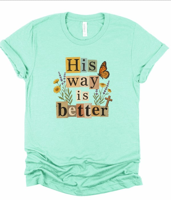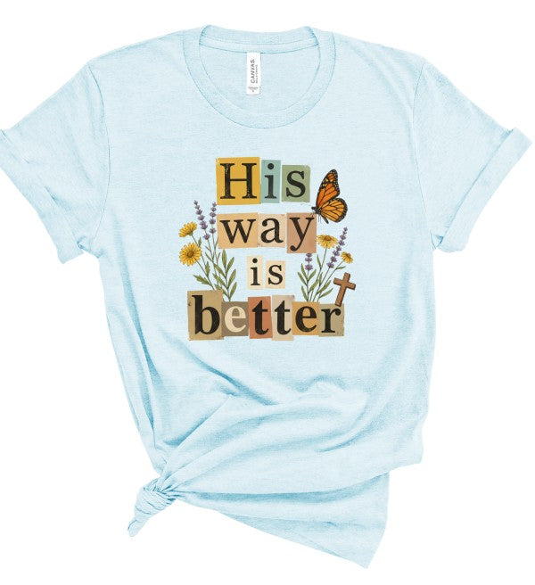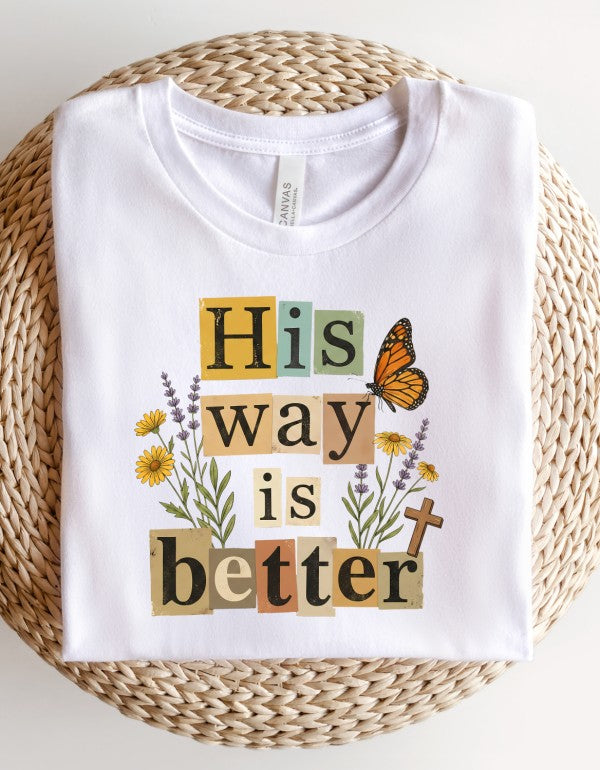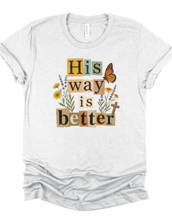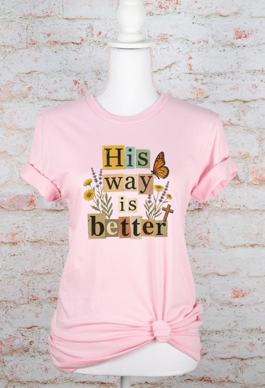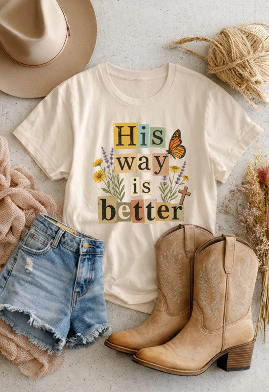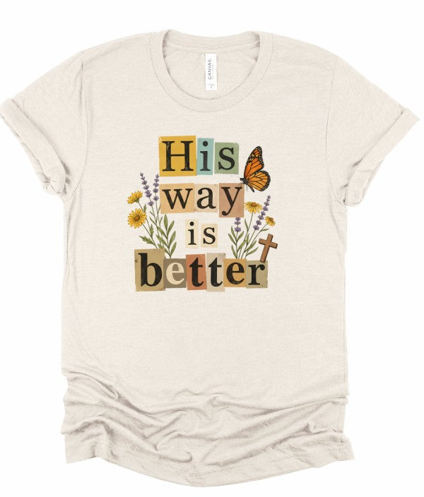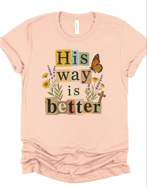 This beautifully layered \"His Way Is Better\" graphic tee features a collage-style typography design accented with delicate florals, a monarch butterfly, and a subtle cross detail. The warm, earthy color palette paired with soft peach fabric gives it an effortless boutique feel your customers will love.